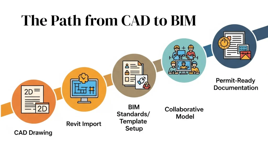 The process of CAD to BIM migration may seem difficult, but it pays off quickly. Firms usually start by converting old CAD drawings into Revit. This requires skilled modelers who understand both systems. Once models are created, they become the base for all future updates.
